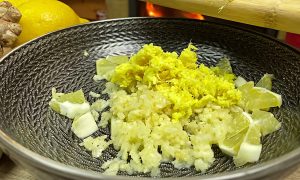 Citrón oloupejte a dužninu nakrájejte na malé kousky. Oloupejte česnek a rozkrájejte jej na poloviny, které následně prolisujte k pokrájenému citrónu. Zázvor oloupejte, nastrouhejte ho na jemném struhadle a přihoďte jej k ostatním ingrediencím.