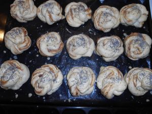 Plech si vystelte pečicím papírem a klubíčka na ně položte. Nechte je dalších 20 minut kynout. Rozšlehejte bílky, které vám zbyly z vajec, a klubíčka jimi potřete. Posypejte je semínky, jako je sezam nebo mák, a dejte péct do trouby rozehřáté na 200 °C po dobu 20 minut.