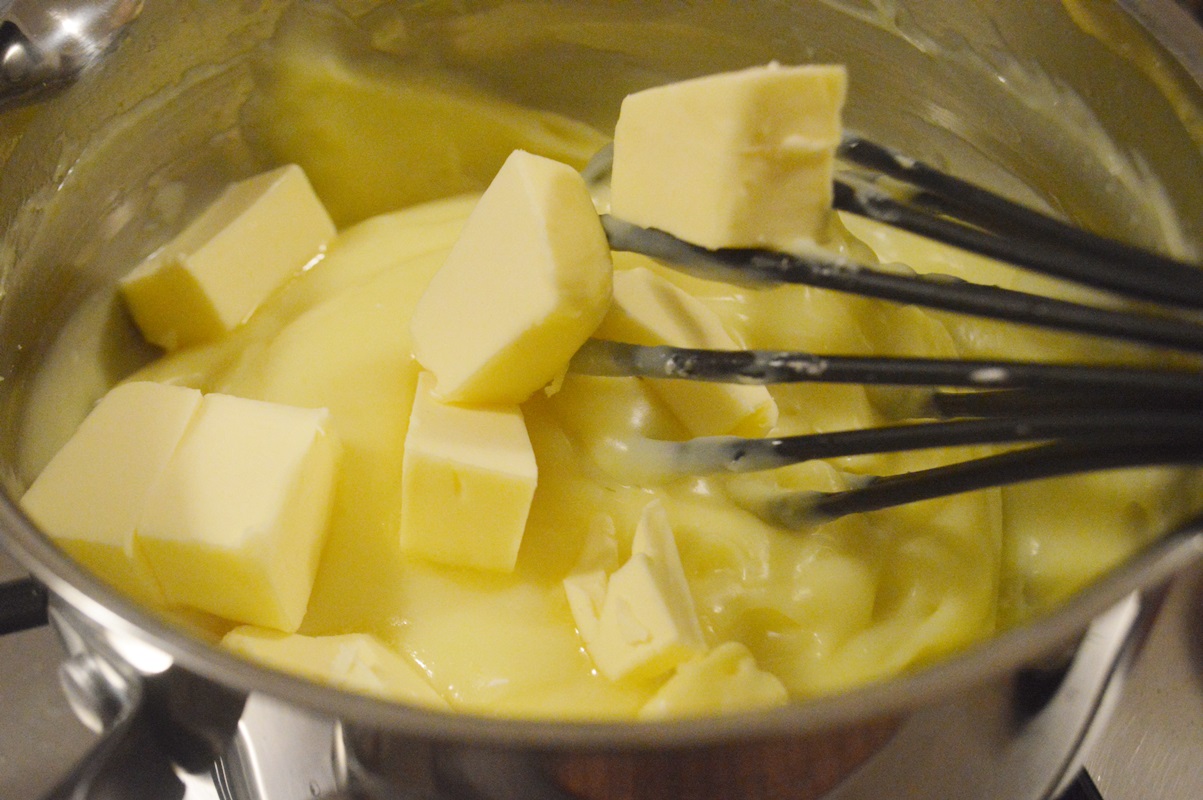 Nakonec krém odstavte a zakomponujte do něj změklé máslo (po kouskách) a vanilkovou esenci pomocí mixéru nebo metličky. Pudinkovou hmotu přikryjte potravinovou fólií a nechte zcela vychladnout.