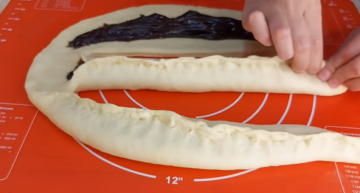Stiskněte k sobě také konec, u kterého se pruhy sbíhají dohromady, a upleťte z plněného těsta jednoduchý copánek. Když dojdete až na konec, spojte všechny tři pruhy k sobě a velmi pevně je zamačkejte. Oba konce pletence ohrňte nahoru a přimáčkněte je tak, abyste je ještě lépe zajistili proti rozplétání.