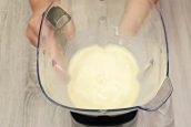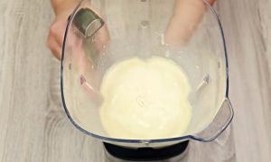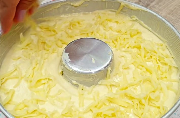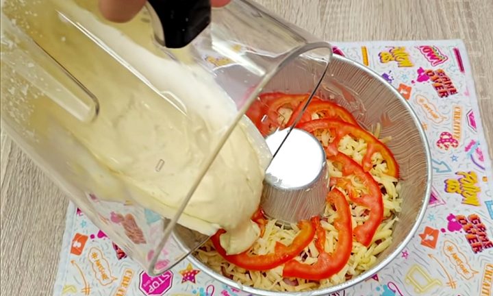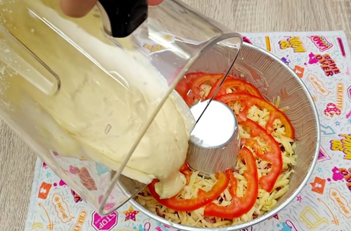 Do mixéru nalijte 3 vejce, přidejte mléko, olivový olej, strouhaný parmazán, špetku soli a vše rozmixujte dohladka. Během mixování do směsi přidávejte po lžících hladkou mouku a pokračujte v míchání, dokud se s těstem zcela nespojí. Nakonec přisypejte prášek do pečiva a mixujte ještě 15 sekund.