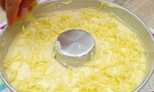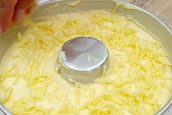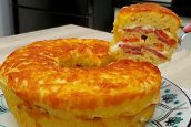 Po dopečení nožem ořízněte bábovku po obvodu formy a opatrně ji otočte na talíř. S pomocí druhého talíře ji otočte opečenou sýrovou vrstvou navrch, nakrájejte ji na porce a podávejte.