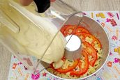 Nádivku ve formě zalijte druhou třetinu těsta z mixéru, kterou opět rozprostřete do rovnoměrné vrstvy tak, aby zcela zakrývala vrstvu náplně. Na druhou vrstvu těsta opět rozložte kolečka salámu, na něj rajčata, opět je zasypejte sýrem a vše zalijte zbylým těstem.
