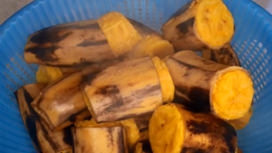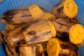 V první řadě si připravíme banány. Nožem odkrojte konce z obou stran a každý z banánů nakrájejte na 3 nebo 4 podobně velké kusy. Do hrnce nalijte vodu a vložte do ní všechny kousky banánů, které jste právě připravili. Vařte zakryté poklicí, dokud nebudou banány dokonale měkké. Bude to trvat asi 25 minut. Poznáte to tak, že se žlutý vnitřek trochu zvětší a bude koukat ze slupky.