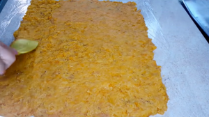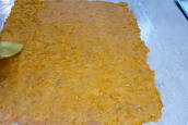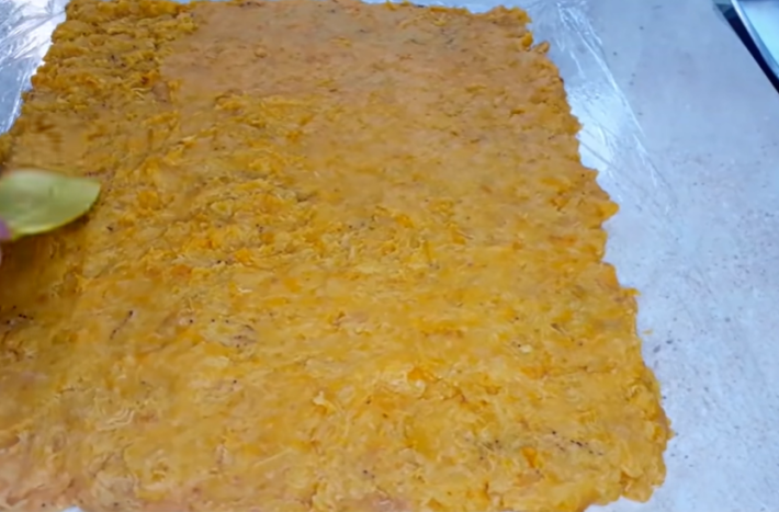 Kousky banánu sceďte a poté nechte chladnout po dobu 10 minut. Oloupejte všechny slupky a přesuňte banány do hluboké mísy. Vidličkou je důkladně rozmačkejte, dokud nezískáte hladkou konzistenci. Na pracovní plochu rozprostřete dva velké kusy potravinářské fólie a rozetřete na ní pár kapek oleje. Na fólii přeneste celou banánovou směs a lžící vytvořte obdélník o tloušťce asi 1 cm.