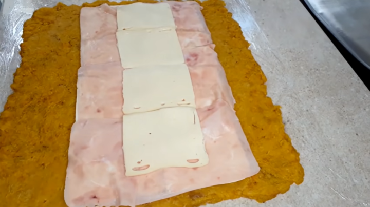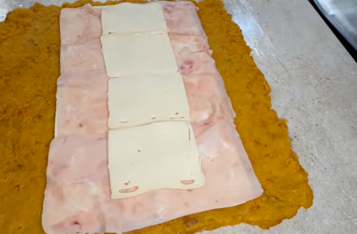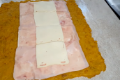 Do střední části rozložte plátkový sýr ve dvou řadách. Na sýr položte plátky šunky podle vlastního výběru a poté doprostřed dejte jednu řadu plátkového sýra. Pomocí fólie ohrňte širší okraje dovnitř a poté přeložte celou roládu napůl. Lehce utěsněte okraje. Zabalte ji do potravinářské fólie a opatrně ji dejte stranou. Nyní si připravte dva velké kusy alobalu, které potřete olejem, aby se roláda nepřipekla. Položte ji na ně a sejměte potravinářskou folii.