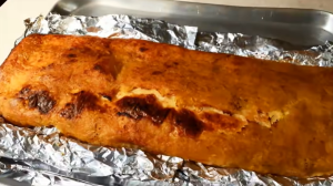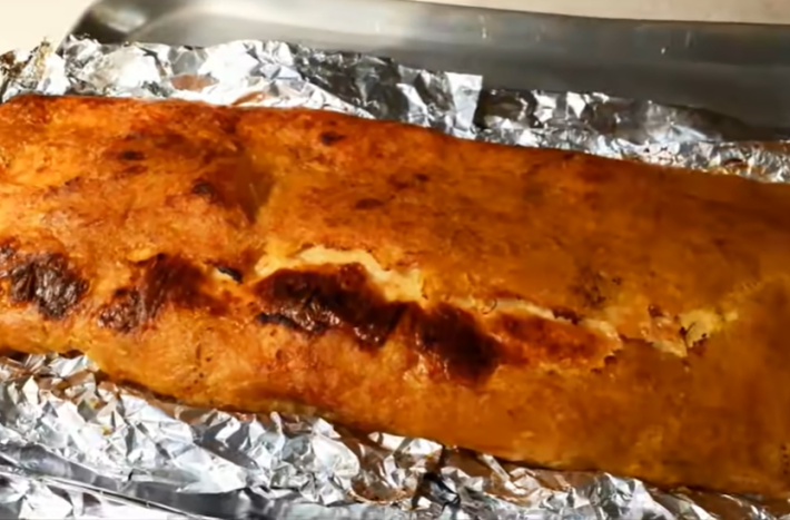 Roládu zabalte do alobalu a položte na plech vyložený dalším alobalem. Pečte v troubě předehřáté na 200 stupňů po dobu 10 minut. Poté alobal otevřete, povrch rolády namažte máslem a vraťte do trouby. Pečte při teplotě 250 stupňů po dobu 15 minut. Nakonec stačí netradiční roládu vytáhnout z trouby, nechat lehce vychladnout, nakrájet a podávat nedočkavým strávníkům.
