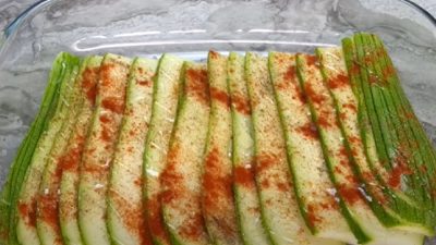 Těsto vylijte na plech, vyložený pečicím papírem, který pomažte olejem a pokryjte ho plátky cukety. Pokrm následně pečte v předehřáté troubě na 180 °C po dobu 25–30 minut.