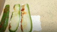 Začněte s přípravou náplně. Z cuket odkrojte okraje, které nebudete potřebovat a na celém povrchu zeleniny vytvořte pravidelné rýhy pomocí vidličky.