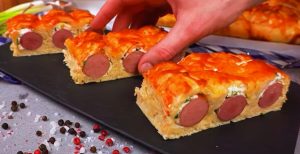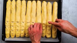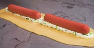 Náplň naneste do středu těsta po celé jeho délce a položte na něj párky. Zabalte je do něj, prsty utěsněte spoje a trochu těsto poválejte na pracovní ploše, aby se nerozbalilo. Plech (30×40 cm) vyložte pečicím papírem a naneste na něj všechny plněné rolky.