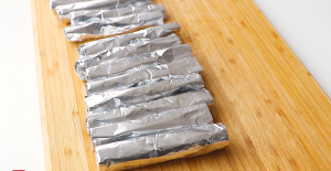 Připravte si roli alobalu, ze kterého připravíte formu na roládky. Odřízněte 40 centimetrů alobalu, přeložte ho podélně na poloviny a pak ještě jednou. Tím vám vznikne pruh o šířce 10 centimetrů. Stočte tento pruh do roličky, ale ne příliš pevně. Měli byste získat válečky o průměru kolem 1,5 centimetru (pokud máte doma originální formy na trubičky, pak tento krok samozřejmě můžete přeskočit). Celkem by jich mělo vzniknout 12 kusů.