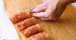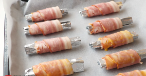 Plátky slaniny obalte kolem alobalových válečků a vyskládejte je vedle sebe na plech vyložený pečicím papírem. Vložte je do trouby vyhřáté na 180 °C a pečte slaninu po dobu 8 až 10 minut, aby na povrchu krásně zezlátla a válečky držely pohromadě.