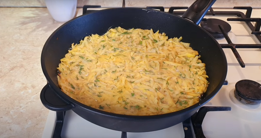Na ohni rozpalte hlubší pánev se silným dnem s trochou rostlinného oleje a rozetřete na ni polovinu připraveného množství těsta. Zaklopte pokličkou a na mírném ohni duste asi 5 minut.
