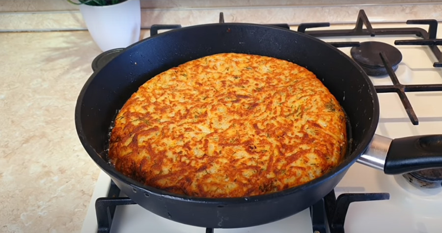 Mezitím na jemném struhadle nastrouhejte svůj oblíbený tvrdý sýr. Pak odklopte pokličku pánve a na bramborovou placku rozložte houbovou směs s cibulkou. Zasypejte strouhaným sýrem a zakryjte druhou polovinou bramborového těsta. Znovu zaklopte a na mírném ohni duste dalších 10 minut. Pak opatrně placku otočte a opékejte ji z druhé strany dalších 10 minut pod pokličkou.