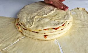 Nyní vytáhněte okraje spodní velké placky, dokud nebudou téměř průhledné. Nožem je nakrojte tak, abyste vytvořili 6 segmentů, které postupně přehněte přes středový sloupec placek a průběžně je po přehnutí potírejte olejem. Výsledný útvar prsty mírně rozprostřete do stran a přeneste ho na plech pokrytý pečicím papírem.
