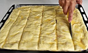 Nyní placku roztáhněte po celé ploše plechu a povrch potřete rozšlehaným vejcem smíchaným se lžící mléka. Placku rozkrájejte na kostky a vložte do trouby rozehřáté na teplotu 190 °C péct, dokud její povrch nezčervená.