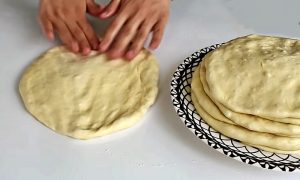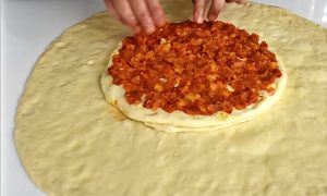 Po odležení rozbalte nejprve větší placku, znovu ji potřete olejem a roztáhněte ji s pomocí prstů na velikou kulatou placku. Pracovní plochu pod ní rovněž natřete olejem, aby se těsto nelepilo.
