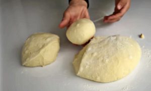 Vraťte se k vykynutému těstu. Trochu ho prohněťte, abyste z něj vyhnali vzduchové bubliny, a vyklopte ho na mírně pomoučněnou pracovní plochu. Posypejte těsto trochou hladké mouky a rukama ho prohněťte a zpracujte do kulatého bochánku. Z těsta odkrojte asi jednu třetinu a zbylé dvě třetiny rozdělte na 6 částí, které zformujte do tvaru kuliček.