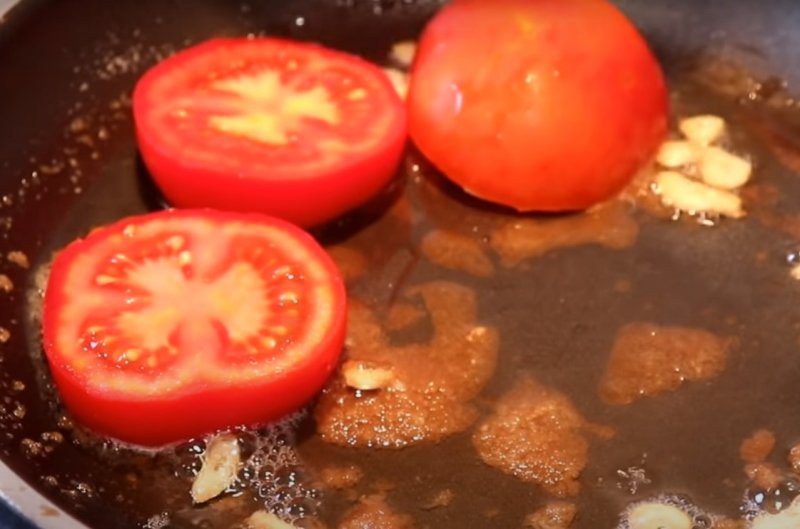 Dále si omyjte čtyři velká rajčata a pokrájejte je na poloviny. Česnek pak oloupejte a naplátkujte. Obě suroviny orestujte asi pět minut na rozpáleném másle.