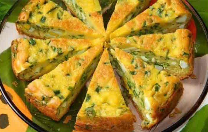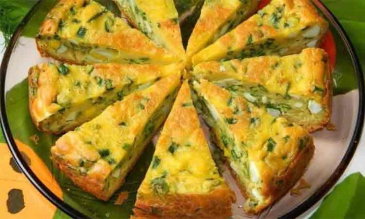Vejce nakrájejte na kostičky, přidejte je k cibulce, osolte, opepřete a promíchejte. Poté směs přidejte k těstu. Kulatou pečicí formu vymažte rostlinným olejem a výslednou směs do něj nalijte. Vložte do předehřáté trouby na 200 stupňů péct na 35 minut. Koláč podávejte teplý, dobrou chuť!