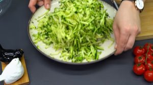 Omyjte dvě mladé cukety, které ještě nemají tvrdá jádra a slupku. Odkrojte z nich konce a pak je i se slupkou nastrouhejte na hrubém struhadle. Poté je prosolte a nechte 15 minut stát, aby pustily vodu. Oloupejte si tři brambory a také je nastrouhejte nahrubo. Zalijte je vodou, aby nehnědly.