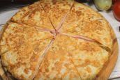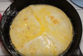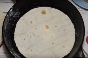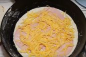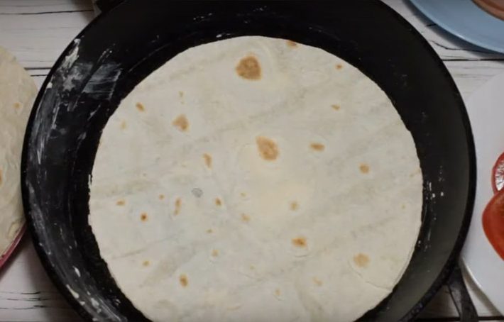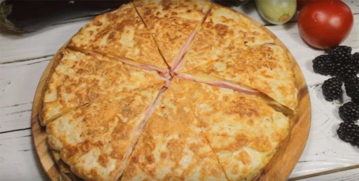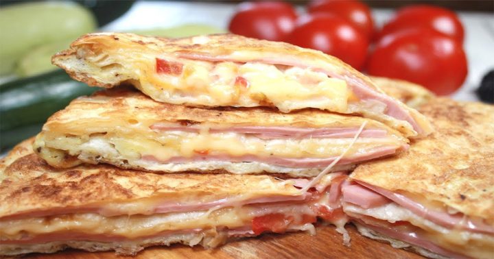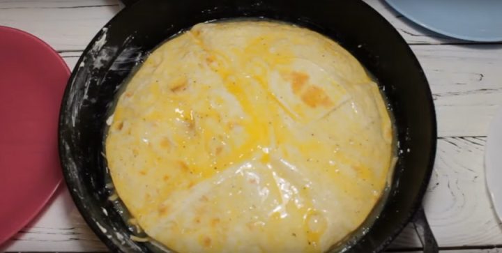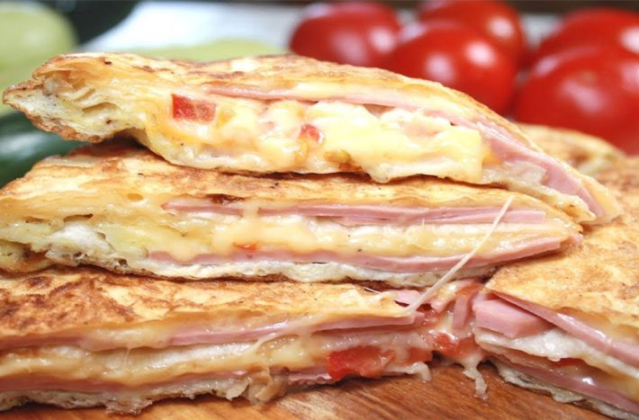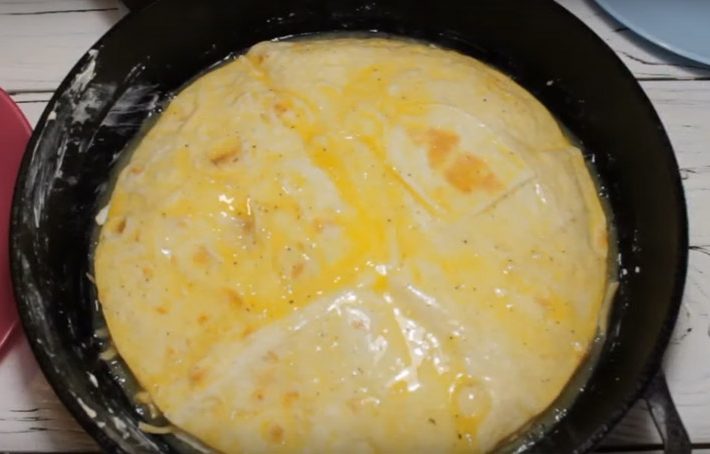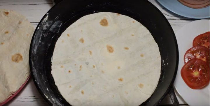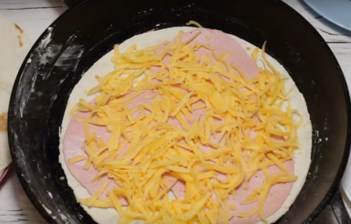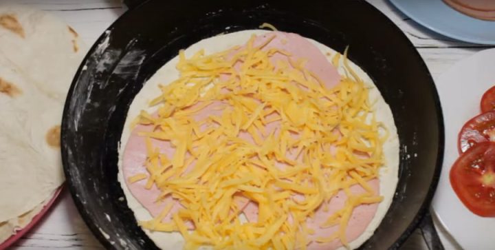 Studenou pánev vymažte máslem a nalijte na ni polovinu rozšlehaných vajíček do vrstvy ideálně o síle kolem půl centimetru. Tuto vajíčkovou vrstvu překryjte jednou tortillou. Plátky šunky či jiné uzeniny rozložte po celé ploše tortilly a posypejte ji strouhaným sýrem. Zakryjte přísady druhou tortillou.