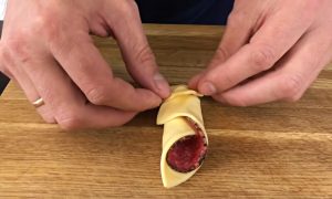 Plátkový sýr působí nejlépe kulatý, vystačíte si ale s jakýmkoliv. Na každý plátek sýra položte kolečko vysočiny nebo jiného podobného salámu a skládejte je s mírným překryvem na spodní část šunkového kruhu. Díky tomu vytvoříte jakousi pomyslnou uzeninovou kytici.