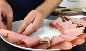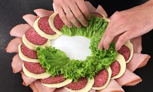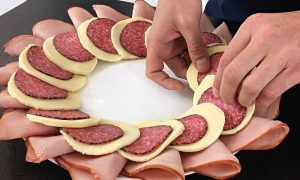 Připravte si velký talíř o průměru kolem 30 cm a začněte na něj skládat suroviny. Nejprve berte plátky šunky nebo uzeného masa, překládejte je napůl a vyskládejte je po obvodu vnější hrany talíře.