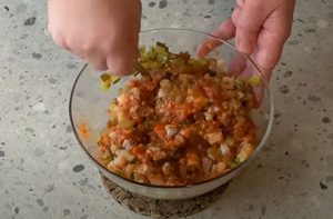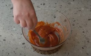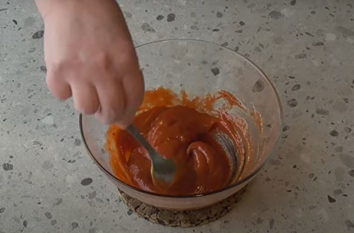 Nakrájejte cibuli nadrobno. Osolte ji a nechejte chvíli odležet v misce, aby pustila šťávu. Přidejte k ní sladký kečup, hořčici, papriku, chilli, čerstvě mletý černý pepř a rostlinný olej. Vše důkladně promíchejte.