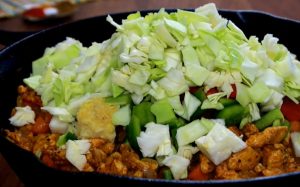 Na pánvi rozehřejte rostlinný olej a osmažte na ní kuřecí kousky ze všech stran. Mezitím nakrájejte cibuli, mrkev, papriky a zelí na drobnější kousky. Nakrájenou cibuli i mrkev přidejte do pánve a důkladně směs promíchejte. Po chvíli přidejte i lžíci prolisovaného česneku, pálivou papričku, klasické papriky a zelí.