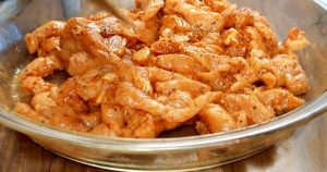 Kuřecí prsa nakrájejte na nudličky a přilijte k nim ocet. Zvlášť smíchejte sůl, kmín, mletou sladkou papriku, kurkumu a mletý černý pepř. Tuto směs koření následně přidejte k masu, důkladně promíchejte a dejte ho marinovat na 30 minut do lednice.
