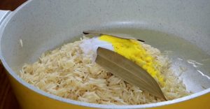 Mezitím připravte rýži. Důkladně ji propláchněte a dejte ji do hluboké mísy. Poté ji zalijte půl litrem vody a nechejte ji odstát po dobu 20 minut. Následně v hrnci rozehřejte rostlinný olej, z rýže slijte vodu a dejte ji do hrnce opékat na oleji. Okořeňte ji solí, bujónem a bobkovými listy. Poté do hrnce přilijte vodu a zakryjte ho pokličkou. Vařte rýži na vysokém ohni, dokud se značná část vody nevyvaří. Poté vařte na mírném ohni po dobu 25 minut.