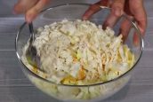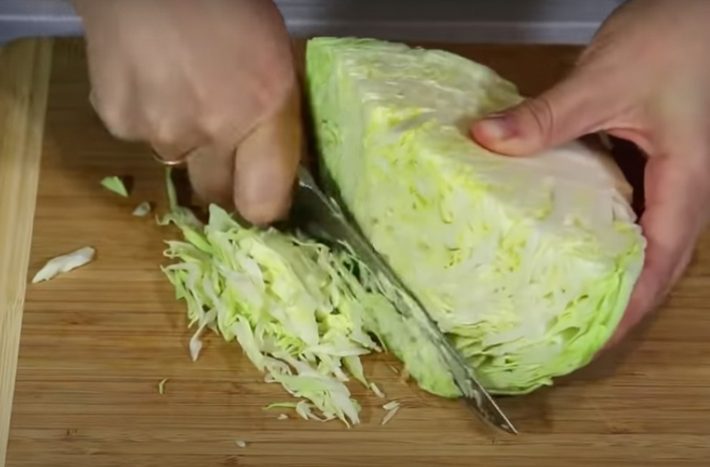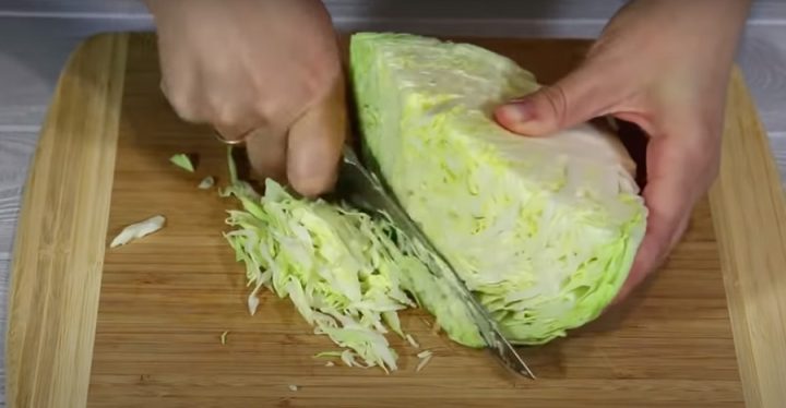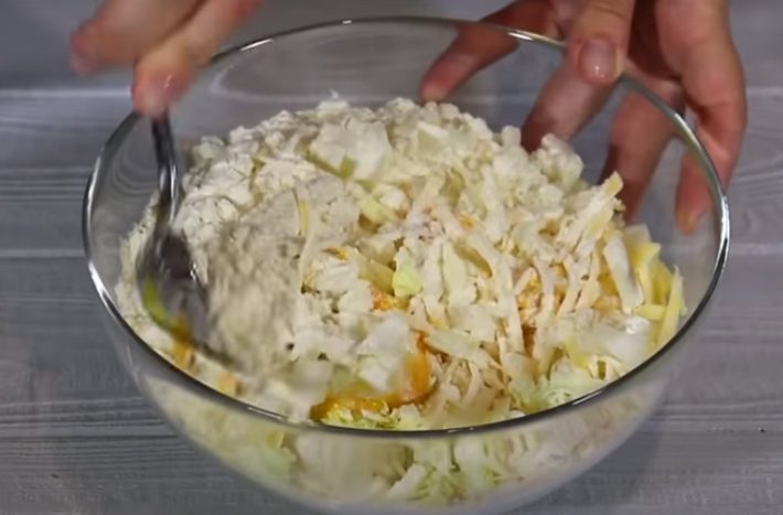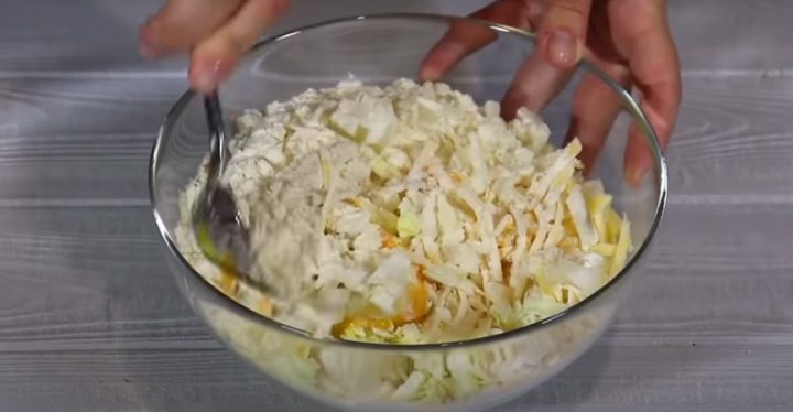 Hlávkové zelí nakrájejte na malé, tenké nudličky. Oloupejte cibuli a nasekejte ji najemno. Zeleninu vložte do mísy a navzájem dobře promíchejte. Do misky vyklepněte také tři vajíčka a směs dobře promíchejte, aby vajíčka obalila všechny kousky zeleniny. Do směsi ještě přidejte škrob a ještě jednou zamíchejte.