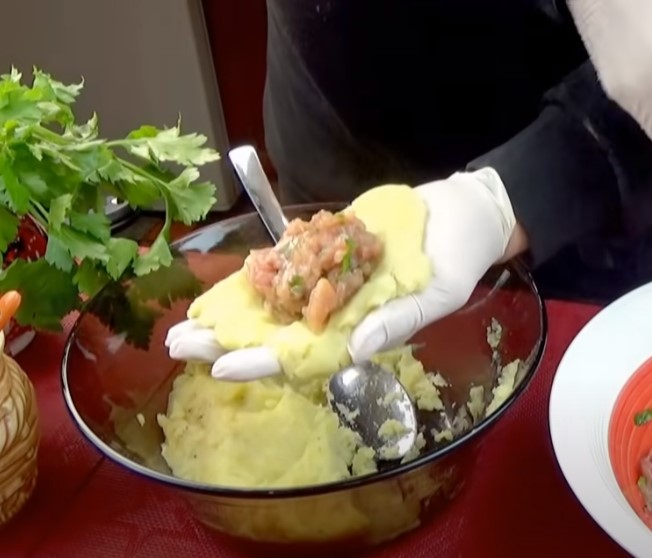 Na jemném struhadle nastrouhejte sýr a smíchejte ho s bramborovou drtí. Z této směsi pak odebírejte kousky asi o velikosti dlaně, rozválejte je na placku a do jejího středu umístěte trochu masové náplně. Bramborovou hmotu kolem masa důkladně uzavřete a zamačkejte, aby se nerozbalovala a stejným způsobem zpracujte i zbytek surovin.