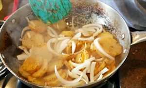 Po pěti minutách přidejte k bramborám do pánve nakrájenou cibulku a brambory dobře promíchejte, aby se u dna nezačaly připalovat. Na středním žáru pak pokračujte v opékání a dušení pod pokličkou. Čas od času je průběžně promíchávejte, aby se všechny rovnoměrně opekly.