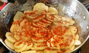 Do hluboké pánve (nejlépe wok) nalijte trochu olivového oleje a přidejte pár kousků másla. Tuk rozehřejte a vhoďte do něj pokrájené brambory. Posypejte je pepřem, sladkou paprikou, solí, tymiánem, sušenou petrželkou nebo jakýmkoliv dalším nebo jiným kořením, které máte rádi. Koření s bramborami promíchejte, přiklopte je pokličkou a nechte je dusit asi 5 minut.