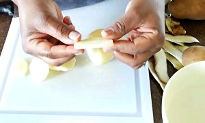 Oloupejte brambory a nakrájejte je na kulaté plátky silné kolem půl centimetru. Čtvrtku cibule nakrájejte na tenké půlměsíčité plátky, které rozdělte na jednotlivé nudličky.