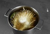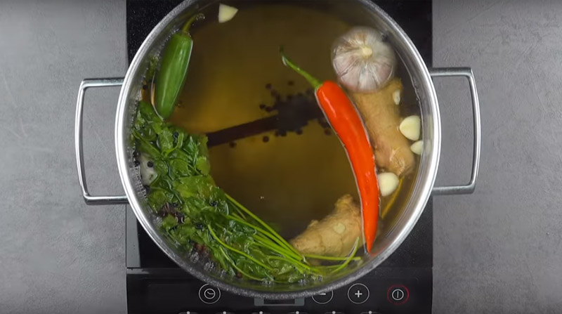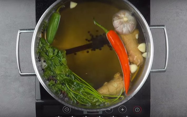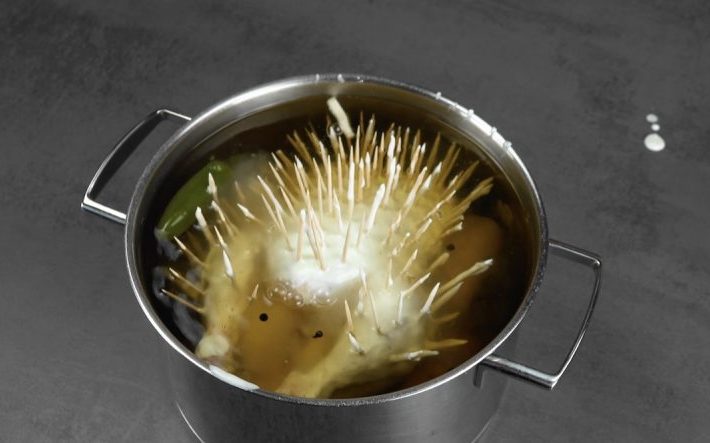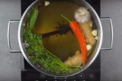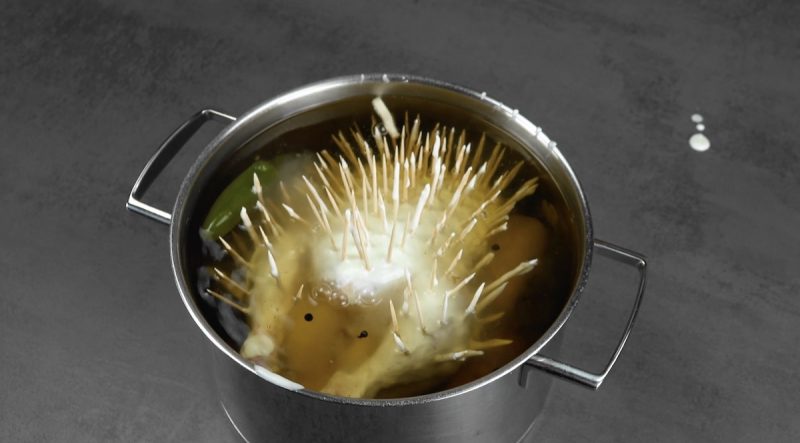 Druhý den si připravte velký hrnec a nalijte do něho 5 litrů vody. Přidejte do ní všechny přísady na marinádu (nic neloupejte ani nekrájejte) a přiveďte k varu. Když začne vřít, odstavte hrnec z ohně a nechte marinádu zchladnout asi na 65 °C.