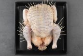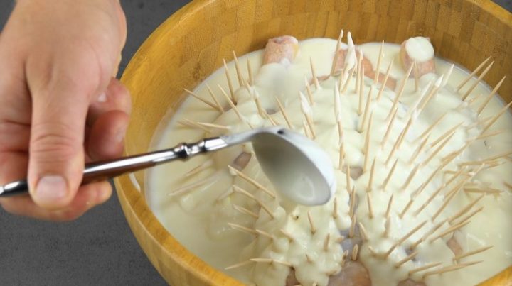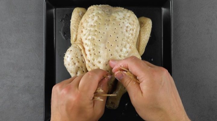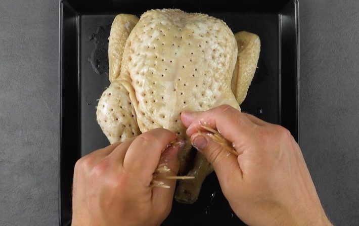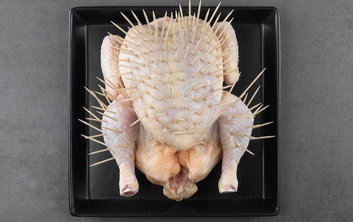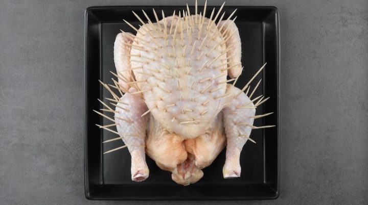 Kuře dobře umyjte a případně dočistěte od zbytků peří. V celku ho položte na plech nebo do vhodně velké mísy a celý povrch stehen i prsou napíchejte párátky. Udělejte z něho jeden velký jehelníček. Nebo ježka.