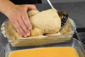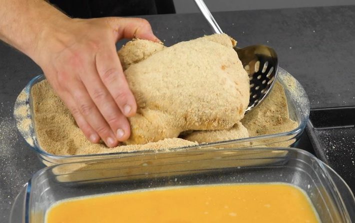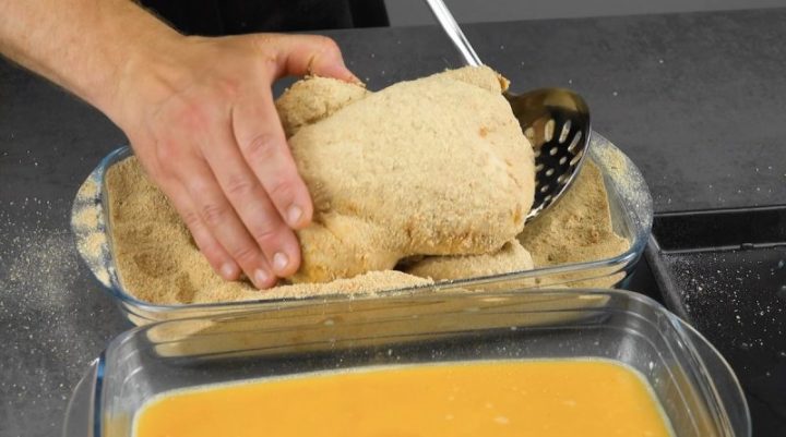 Do hluboké mísy rozbijte příslušný počet vajec a metlou je rozšlehejte. Položte do rozšlehaných vajec kuře a celé ho dobře obalte.