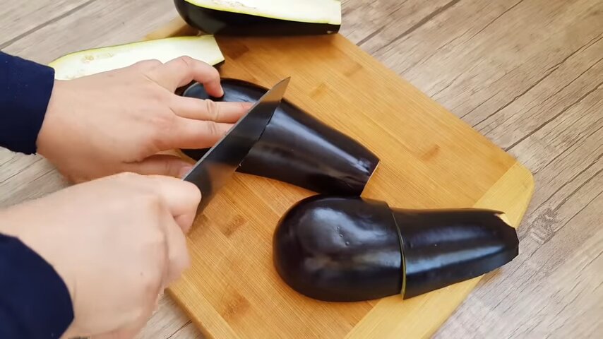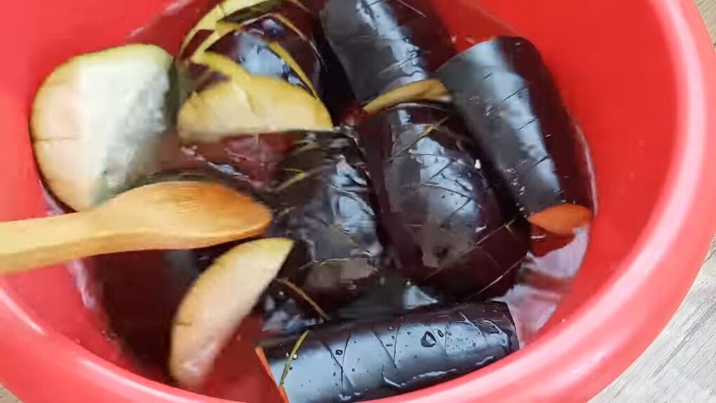 Takto připravené lilky vložte do mísy, zasypejte je solí a zalijte vodou. Nechte je takto stát 15 až 20 minut, aby se odplavila hořká šťáva. Pak lilky dobře opláchněte proudem studené vody.