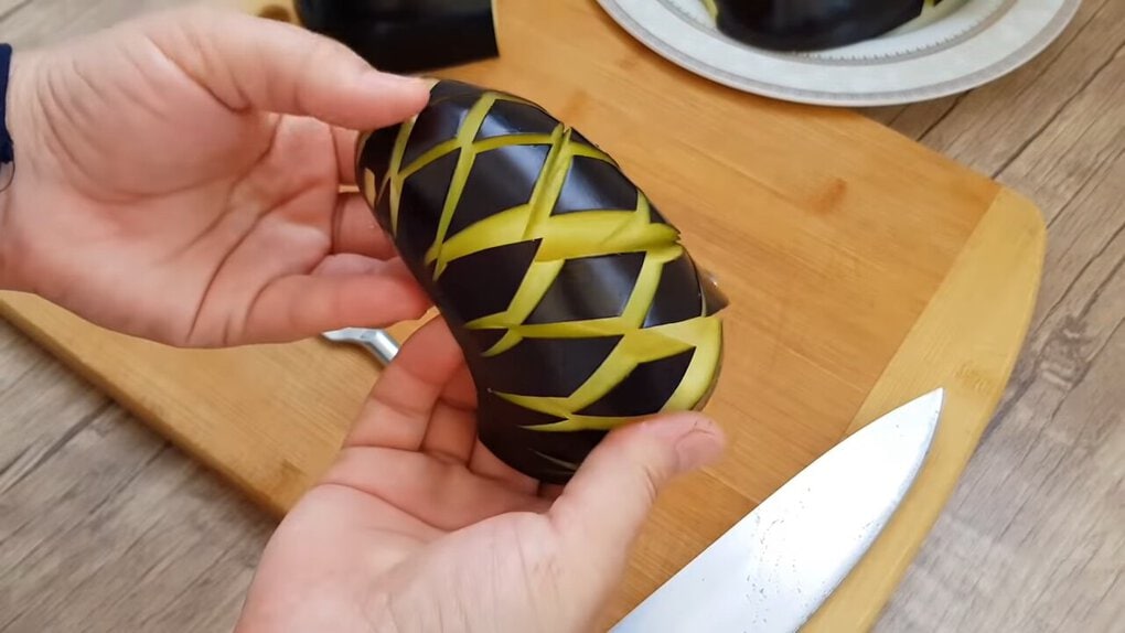 Zářezy nože pak vytvořte do dužniny na straně slupky hluboké zářezy ve tvaru mřížky.