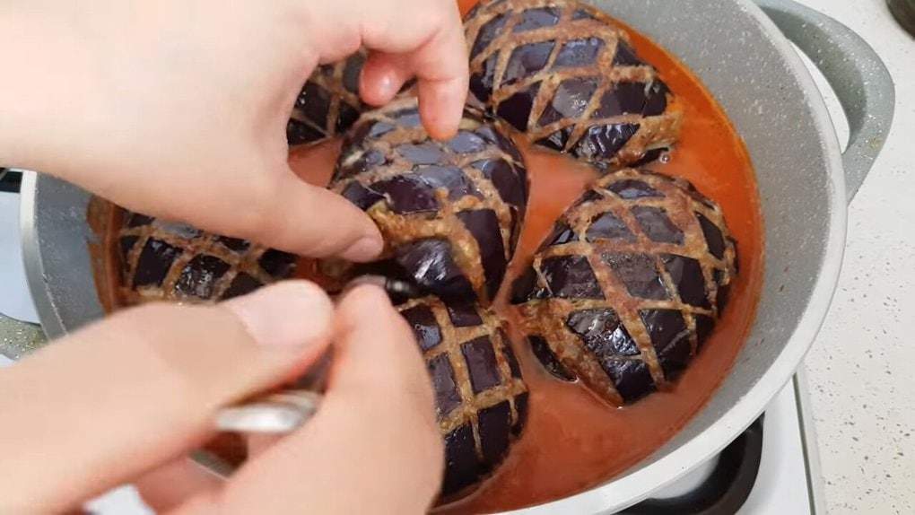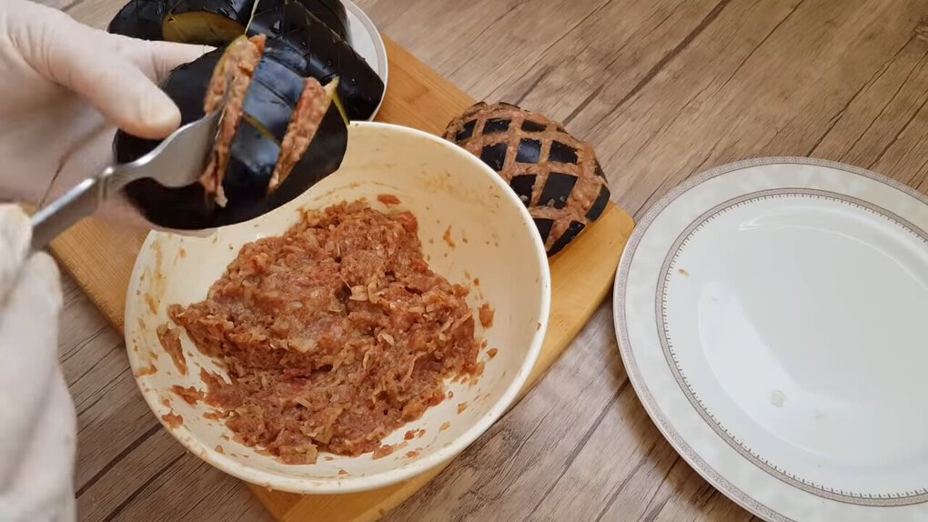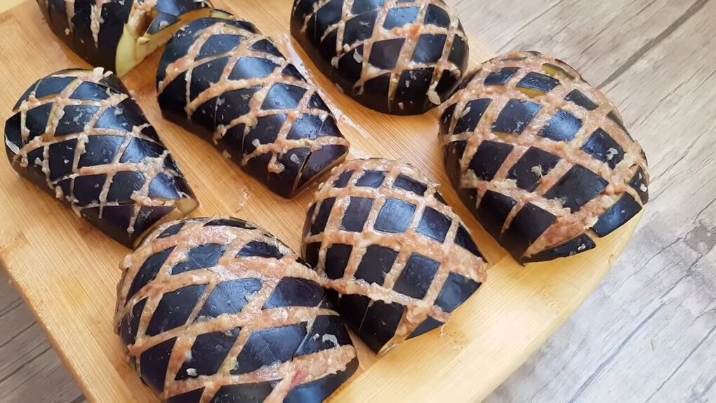 Masovou směsí pak naplňte zářezy na povrchu lilku.