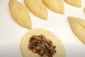Mezitím připravte náplň. Máslo rozpusťte v rostlinném oleji na pánvi a osmažte v ní cibuli nakrájenou nadrobno. Přidejte mleté maso, osolte, opepřete a okořeňte dle chuti. Směs orestujte a poté přesuňte do mísy.