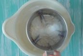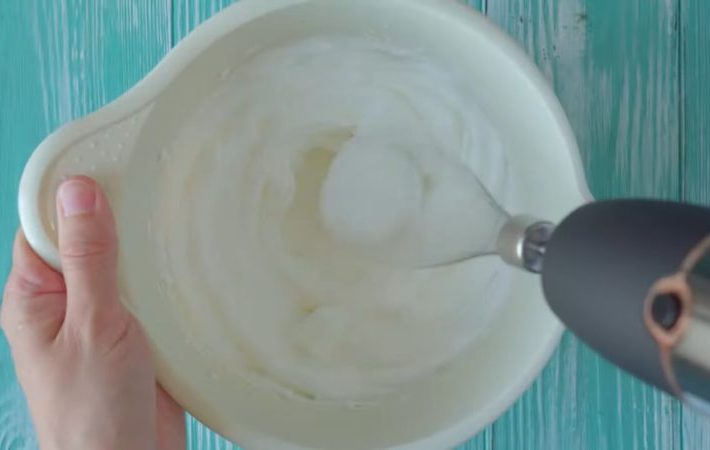 Z vajíček si oddělte bílky, žloutky odložte na jindy a bílky v misce vyšlehejte do pevné pěny.