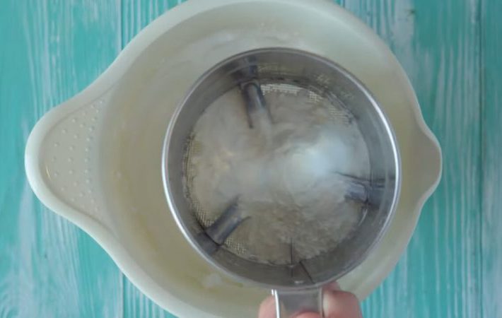 Přes sítko prosejte do bílkového sněhu hladkou mouku a také prášek do pečiva a vařečkou velmi jemně směs promíchejte.