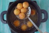 Když jste zpracovali veškerou sýrovou hmotu na kuličky (mělo by jich být zhruba 24 kousků), rozpalte na kamnech hlubokou pánev nebo kastrůlek s vysokou vrstvou oleje, případně můžete použít i fritézu. Všechny sýrové kuličky pak vhoďte do horkého oleje a smažte je po dobu kolem 30 až 40 sekund, dokud jejich povrch nezezlátne.