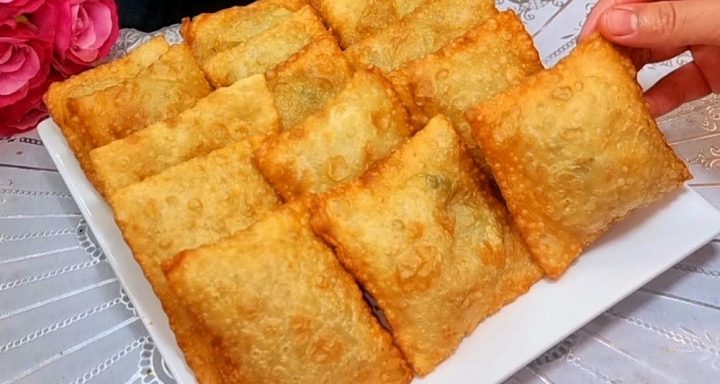 Doprostřed každého čtverečku dejte trochu náplně. Pak druhou polovinu těsta rozválejte na stejně velkou placku, s níž tu první s náplněmi přikryjte. Těsto dále mezi náplněmi spojte a pak rozkrájejte kolečkem na pizzu na čtvercové taštičky. Na pánev dejte rozpálit dostatek oleje a taštičky na něm poté usmažte z obou stran dozlatova.
