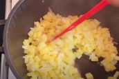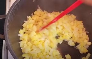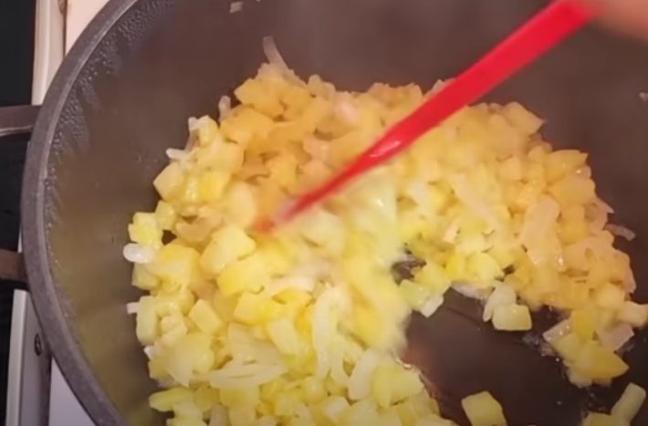 Nakrájejte brambory na kostičky. V hrnci rozpalte trochu oleje, přidejte brambory, promíchejte je a nechte je 5 minut smažit na středním plameni. Pak přidejte nakrájenou cibuli a pod poklici za občasného míchání smažte do změknutí.