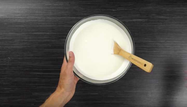 Do misky nalijte kefír a přidejte k němu zakysanou smetanu. Směs osolte jednou lžičkou soli a důkladně promíchejte.